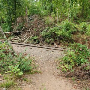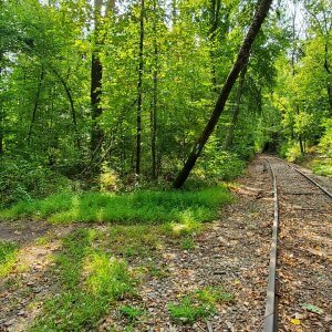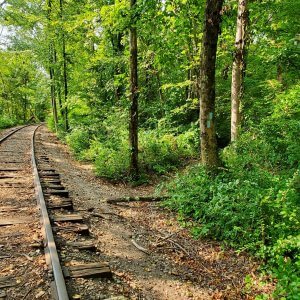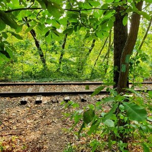 As you walk along the tracks, keep an eye out for blazes on the right, then turn right to continue through the woods.