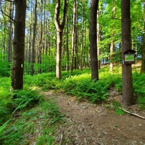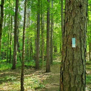 Continue through beautiful forest of pine trees with wonderful specimens of tulip and beech trees until you reach a junction with another map. Turn left to follow the white trail.