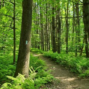 Stay straight until you come to this junction, then veer left, uphill, and continue following the blue blazes. There is a lot of invasive garlic mustard on this section. While it’s past its prime for eating during the summer, you can visit in early spring to forage this edible plant. Learn how to identify it and cook with it here.